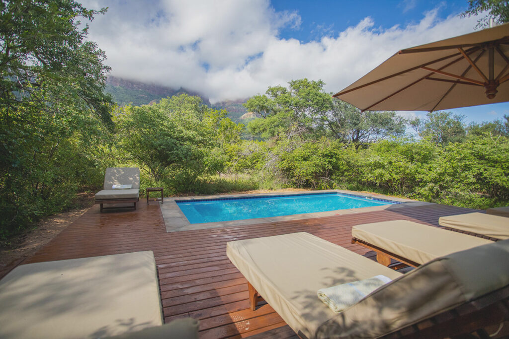 The spacious main lodge building and its expansive viewing decks are where you’ll discover the meaning of “escape” as you relax to the songs of a myriad birds, enjoying the breathtaking views of the mountains beyond. With its spacious indoor and outdoor lounge and dining areas, sunken boma for evenings around a crackling log fire and fully stocked bar, this is the beating heart of Cape Vulture Lodge.